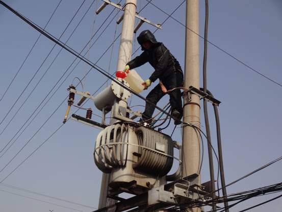 圖為維護(hù)人員正在為居民生活區(qū)的變壓器進(jìn)行加油