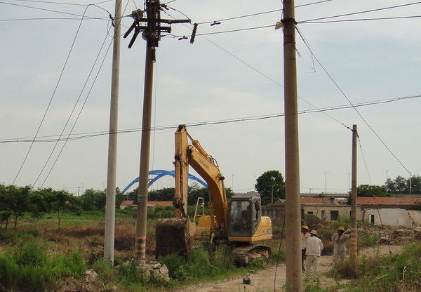 當日上午9時,室外溫度高達35攝氏度,板橋、板橋工業(yè)園等片區(qū)突發(fā)停電。人們被迫從空調(diào)房中走出來,匆匆忙忙尋找避暑的地方。臺南供電所負責人接到報告后,迅速啟動應(yīng)急搶修預(yù)案,并立即安排人員分頭查找停電原因。經(jīng)過認真巡視檢查,終于發(fā)現(xiàn)了停電原因:金港灣物流園“板橋線”75#變壓器附近的59#電桿,由于挖掘機施工時操作失誤而倒地,并導(dǎo)致同向4根線桿倒地斷裂,造成轄區(qū)內(nèi)大面積停電。要恢復(fù)正常供電,必須重新架設(shè)電桿。于是,該所領(lǐng)導(dǎo)立即通知相關(guān)工作人員,組織準備相關(guān)設(shè)備、器材。10時許,副所長朱兵帶領(lǐng)搶修人員和準備齊全的設(shè)備器材,趕往現(xiàn)場進行搶修。