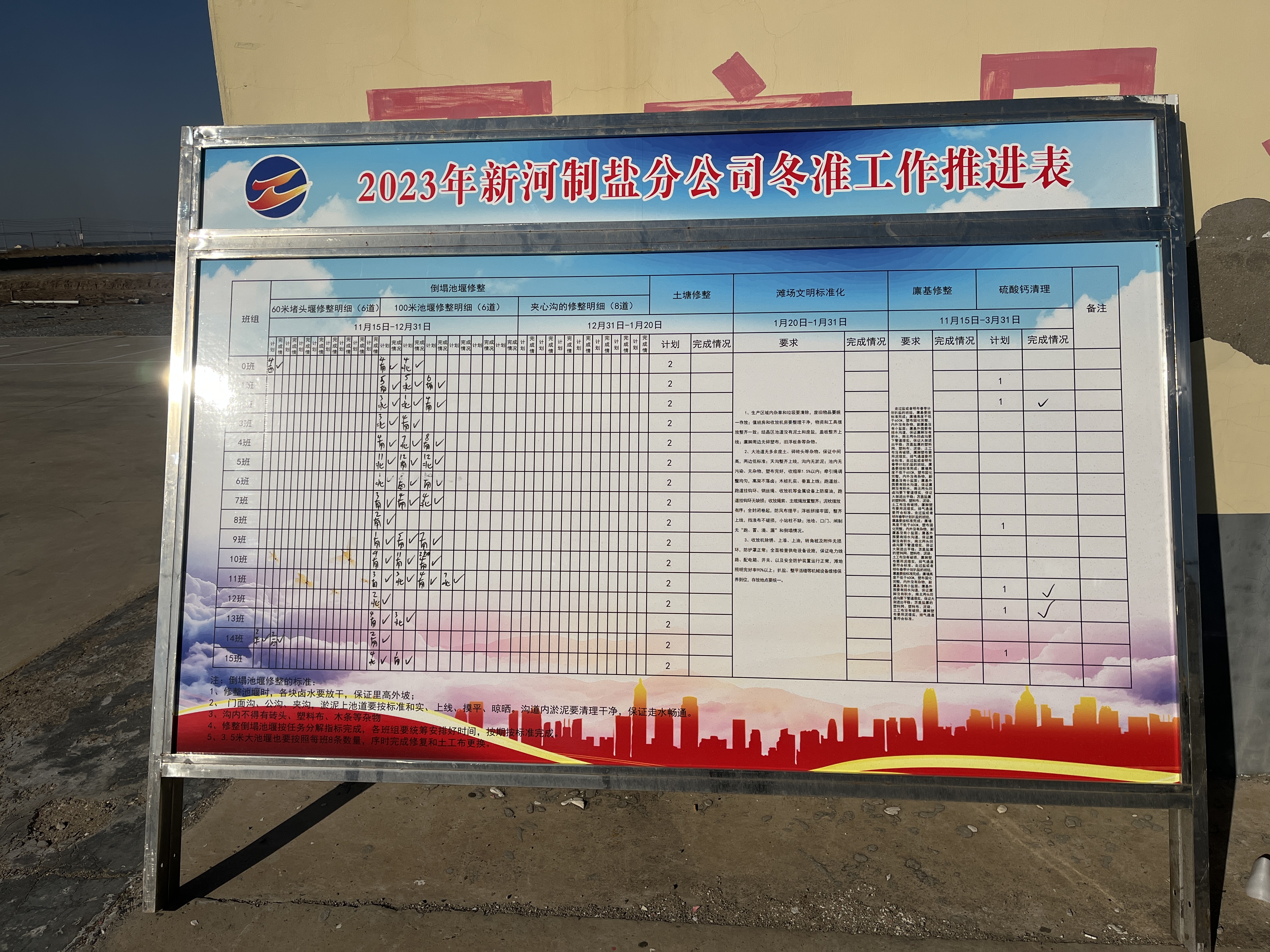 冬季是日曬制鹽收儲鹵水、扒土塘、整理灘場文明的最佳時期,也是為2024年工作起好頭、邁好步的關(guān)鍵時期,自冬準(zhǔn)工作開展以來,新河制鹽分公司制定冬準(zhǔn)工作推進表,掛圖作戰(zhàn)按時推進冬準(zhǔn)進度。