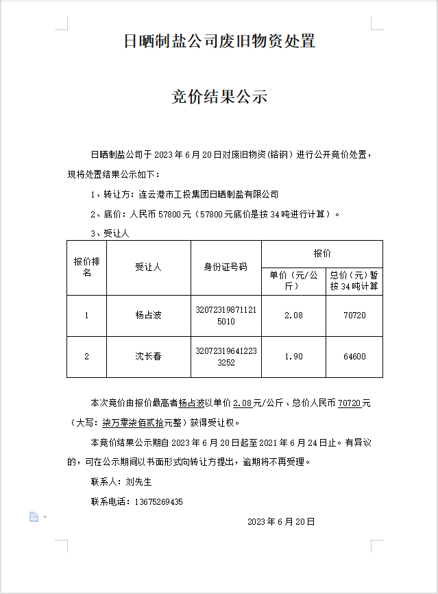日曬制鹽公司廢舊物資處置競價(jià)結(jié)果公示