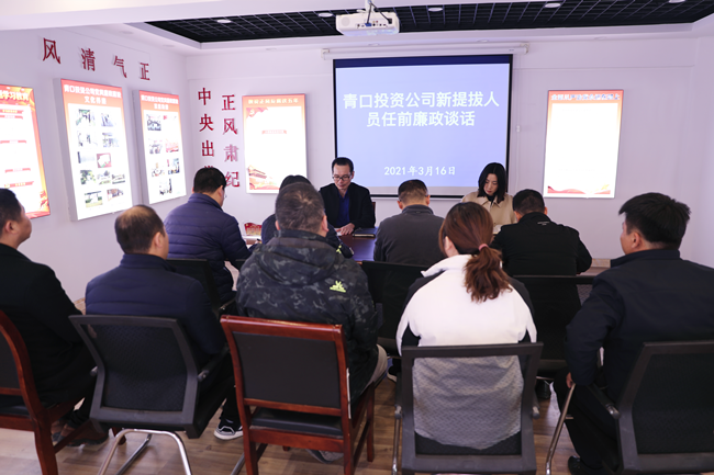 ? ?3月16日下午,青口投資公司紀(jì)委書(shū)記朱文兵對(duì)九名新提拔人員進(jìn)行任前集體談話(huà),相關(guān)人員參加了此次會(huì)議。? ? ? ? ? ? ? ? ?