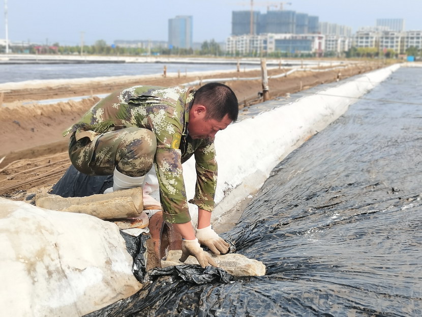 礦鹽班組根據(jù)天氣狀況做好雨前塑布苫蓋工作,確保勞動成果不受暴雨影響,最大化實(shí)現(xiàn)年產(chǎn)量,并利用扒鹽停機(jī)間隙做好灘地基礎(chǔ)工作,維護(hù)輸鹽管道及集鹽機(jī),以便于扒鹽開機(jī)高效率運(yùn)轉(zhuǎn)。